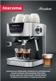 Cleaning the opening with seal for fastening the lever Switch off the coffee machine and remove from it the water reservoir. If needed, use a paper napkin to remove any residues of spent coffee from the opening with seal for fastening the lever 16 . Cleaning the steam nozzle After preparing milk froth, remove the collar from the steam nozzle 17 . Thoroughly wipe the nozzle using a moist cloth and dry it, thoroughly wash the collar under running water, dry and set back into place. Notice: The steam nozzle and collar are very hot in use. Always handle the steam nozzle using the safety grip, leave the nozzle and the collar to cool down before cleaning. Cleaning the coffee machine Clean the drip grid and dish under running water; they are dishwasher safe. Clean the water reservoir using normal cleaning agents under running water and dry, do not wash in dishwasher. Clean the warmer and the other stainless steel and plastic surfaces using a moist cloth and dry. Do not wash the coffee machine under running water or in dishwasher. Storage and maintenance If you do not use the coffeemachine, store it with the water reservoir clean and empty. If the coffeemachine does not work properly, proceed following the instructions in the next section. Do not repair a coffee machine yourself; instead contact a TESCOMA retail centre or service centre; for contact details, go to www.tescoma.com . Quick troubleshooting Coffee flowing out of the top of the lever. - There is too much coffee in the filter or the coffee is too tightly packed. Repeat the process of dosing and preparing coffee. - Coffee in the filter is too finely ground. Use coffee ground to a degree suitable for preparing espresso. -There are residues of spent coffee on the seal in the opening for lever attachment. Clean the openingwith seal for lever attachment. - The seal in the opening for lever attachment is defunct due to prolonged use. Contact a TESCOMA service centre. The pressure pump produces unusual sounds. - There is no water in the reservoir. Add water to the reservoir. - The water reservoir is placed wrongly in the coffee machine. Check the reservoir and place it correctly in the coffee machine. The coffee prepared is not hot enough. - The coffee machine was not heated to the operating temperature before starting coffee preparation. Repeat the process of switching on the coffee machine, dosing and preparing coffee. The coffee prepared is too dark. - Too much coffee has been placed in the filter or the coffee is too tightly packed. Repeat the process of dosing and preparing coffee. - The metal strainer in the coffee maker lever is clogged. Clean the strainer by thoroughly rinsing it or using a brush. - Scale has formed on the parts inside the coffee machine. Decalcify the coffee machine. The coffee prepared is too weak. - There is too little coffee in the filter, the coffee in the filter is not sufficiently packed or too coarsely ground coffee has been used. Use coffee ground to a degree suitable for preparing espresso and repeat the process of dosing and preparing coffee. The lever with the filter inserted cannot be fastened in the coffee machine. - Too much coffee is placed inside the filter. Repeat the coffee dosing process. - The lever has been inserted into the opening in the coffee machine under a wrong angle. Insert the lever again under the correct angle. - The lever or the opening for inserting the lever is damaged. Contact a TESCOMA Service Centre. No steam flows out of the steam nozzle. - The nozzle and its collar have not been properly cleaned. Clean the collar and nozzle; clean the nozzle orifice with a narrow brush if it is clogged. Decalcify the steam nozzle of the coffee machine if needed.